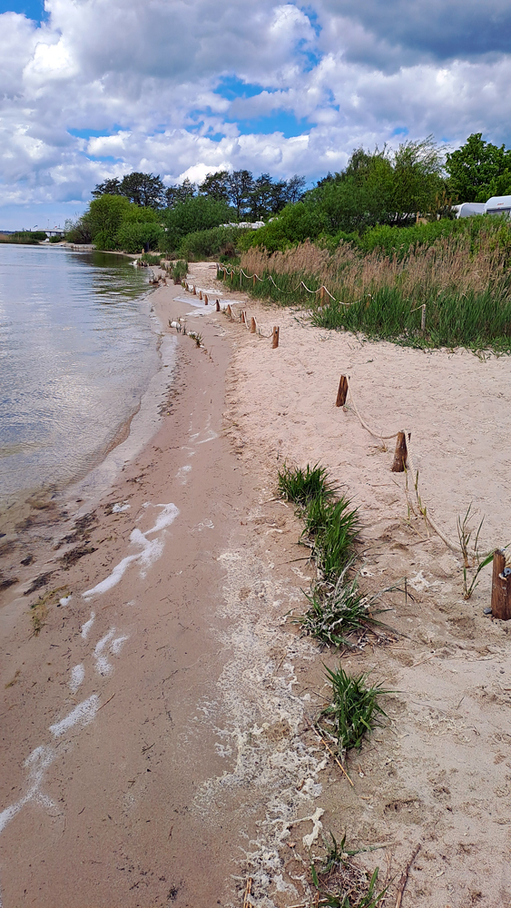 Natomiast na obszarze w sąsiedztwie kampingu Chałupy 6, zmiany są drastyczne. Nie dość, że stanowisko nasadzonej trzciny zostało zdewastowane (zdj. 5, 6), to brzegi plaży zostały sztucznie umocnione (zdj. 7, 8, 9, 10, 11, 12). Umocnienie nie dość, że w postaci desek trzymających nasyp, to jeszcze dowieziono i usypano umocniony brzeg piaskiem innego pochodzenia niż zatokowy.