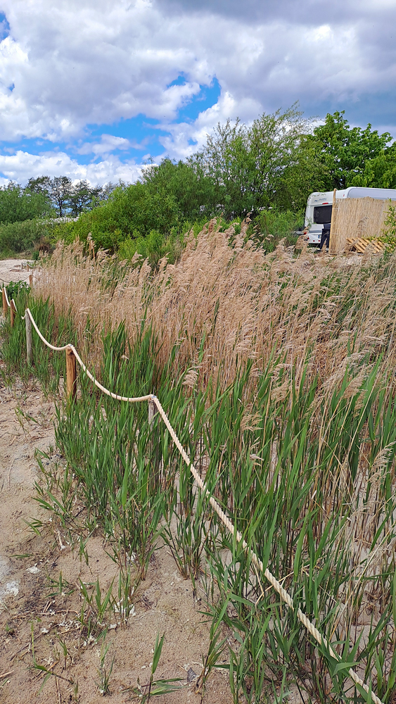 Małe Morze. Na tym obszarze trzcinowiska utrzymane są w bardzo dobrym stanie, jest to jeden z pierwszych kempingów, który zadbał o ten aspekt. Tu również zadbano o swobodny rozrost trzcinowisk. Tak jak na pozostałych obszarach nasadzeń, pozostawiono zatoczki między nasadzeniami do użytku dla turystów. |